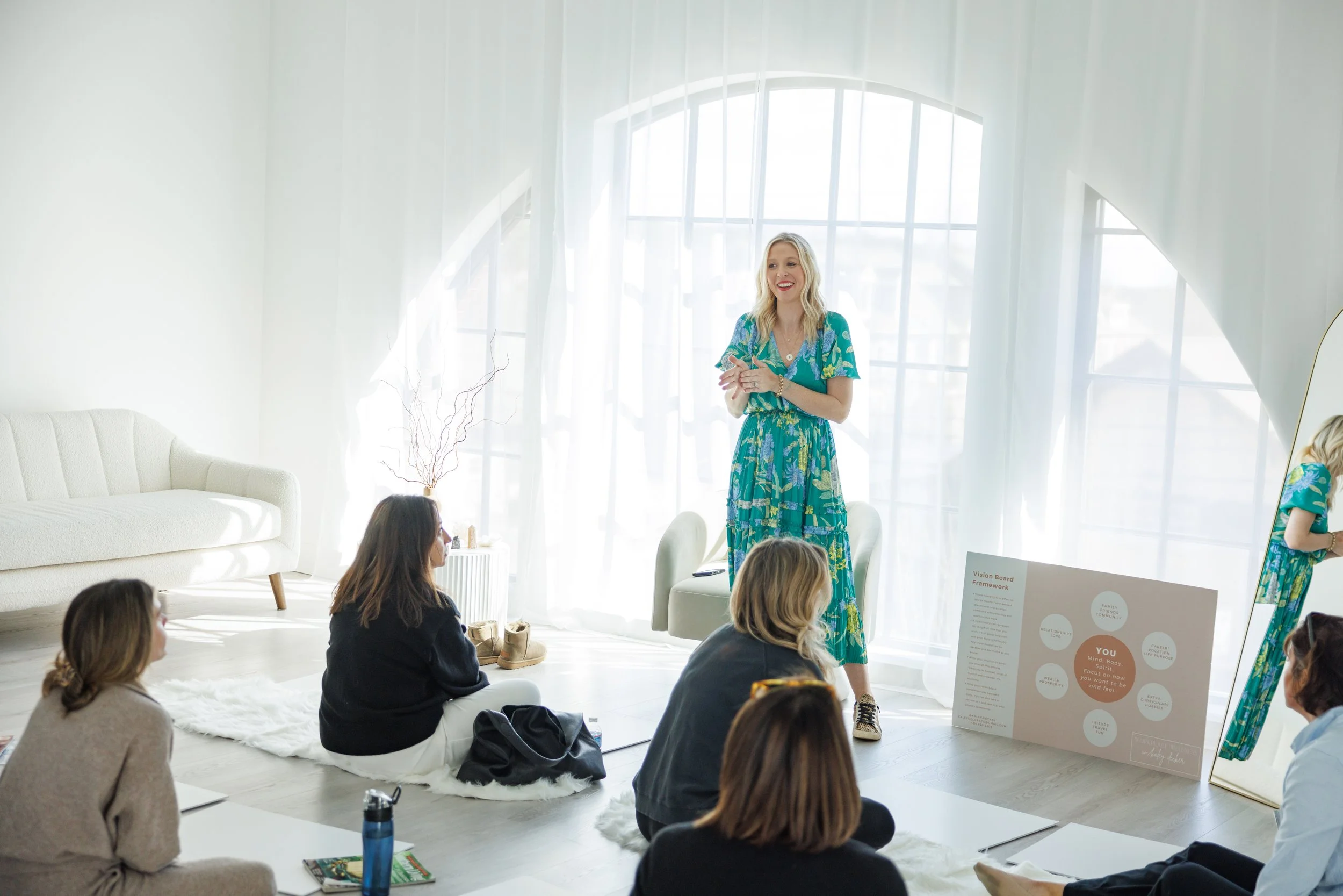 Monthly or quarterly in-person workshops like vision boarding, burnout-to-breakthrough sessions, and sound bowl healing.